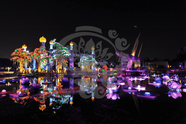 就是自貢燈會與自然環境的完美結合,它將璀璨奪目的燈布展于園林山水中,形成燈景交融、層次迷離的獨特風采。無論是精巧別致的工藝燈,還是宏偉壯觀的大型燈組,都布展于園林山水之中,湖光山色、亭臺水榭與燈融為一體,形成燈中有景、景中有燈,燈景交織的奇妙景觀。觀眾稱之為“燈的山,燈的樹,燈的水,燈的路”。波光水影、風簫聲動,燈景渾然一體,彩燈藝術的人工美與園林山水的自然美珠聯璧合,組成了瓊樓玉亭、層次迷離的美妙世界,展示了燈景渾然,千光萬彩的獨特風采!