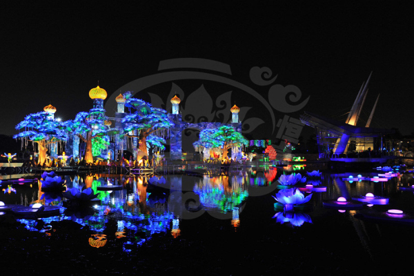 就是自貢燈會與自然環境的完美結合,它將璀璨奪目的燈布展于園林山水中,形成燈景交融、層次迷離的獨特風采。無論是精巧別致的工藝燈,還是宏偉壯觀的大型燈組,都布展于園林山水之中,湖光山色、亭臺水榭與燈融為一體,形成燈中有景、景中有燈,燈景交織的奇妙景觀。觀眾稱之為“燈的山,燈的樹,燈的水,燈的路”。波光水影、風簫聲動,燈景渾然一體,彩燈藝術的人工美與園林山水的自然美珠聯璧合,組成了瓊樓玉亭、層次迷離的美妙世界,展示了燈景渾然,千光萬彩的獨特風采!