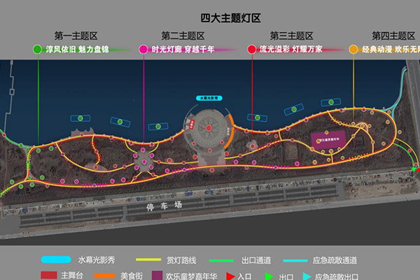 本次燈會分為四大主題,第一個主題為“淳風依舊 魅力盤錦”,主要是為了展示盤錦特色的風土人情,第二個主題為“時光燈廊 穿越千年”,展示了千年盤錦,魅力特色。第三主題為“流光溢彩 燈耀萬家”,展示燈的海洋,身臨其境被燈震撼。第四主題為“經典動漫 歡樂無窮”,本主題為兒童區,把經典的動漫造型以燈的形式展現在人們眼中。