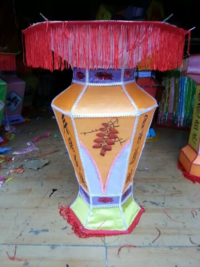 現代宮燈主要以鋼絲為骨架,塑料成型的上下座,和空心鐵桿為支撐,顏色絢麗的布料為主要原料手工制作完成。