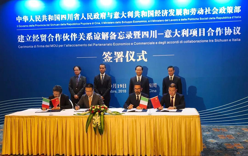 2018年9月19日下午,中華人民共和國(guó)四川省人民政府與意大利共和國(guó)經(jīng)濟(jì)發(fā)展和勞動(dòng)社會(huì)政策部關(guān)于“建立經(jīng)貿(mào)合作伙伴關(guān)系諒解備忘錄暨四川—意大利項(xiàng)目合作協(xié)議簽署儀式”,在成都隆重舉行。在意大利副總理迪馬約,四川省委書記彭清華,四川省委常委、省委秘書長(zhǎng)王銘暉,副省長(zhǎng)彭宇行,意大利經(jīng)濟(jì)發(fā)展部副部長(zhǎng)杰拉奇教授,意大利駐華大使謝國(guó)誼,意大利駐渝領(lǐng)館,意大利對(duì)華關(guān)系促進(jìn)協(xié)會(huì)等領(lǐng)導(dǎo),和意大利、中國(guó)眾多媒體嘉賓的見證下,