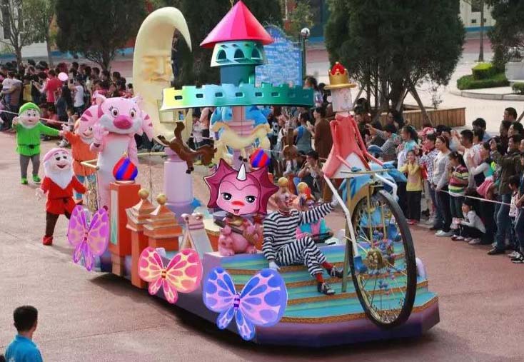 《夢游仙境》長15米高6米寬6米玻璃鋼彩繪花車。城堡是孩子們對童話世界幻想和向往,月亮城堡里呈現出小動物們歡樂玩耍的場景,旋轉木馬,小動物們彈琴歌唱,帶動著游客歡快喜悅的心情。