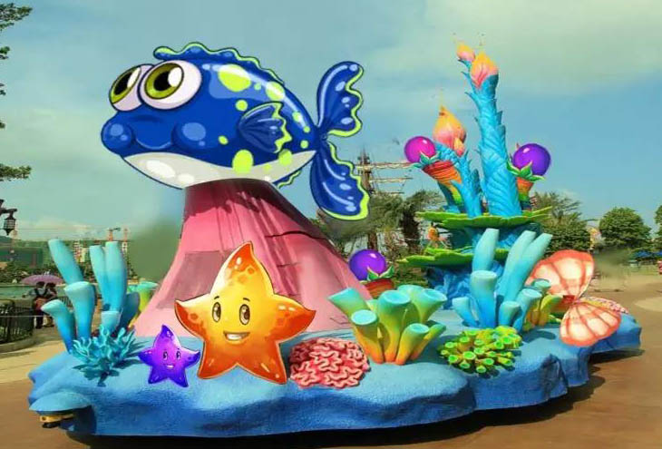 《海洋總動員》長15米高7米寬6米玻璃鋼彩繪。以海洋珊瑚礁和海洋生物為特色來制作的一臺卡通動漫花車,配合舞蹈演員根據海洋相關主題制作相關服飾。