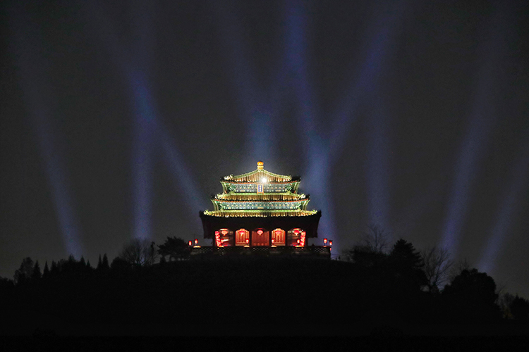 景山下的步道上,一盞傳統花燈亮起,別具古韻